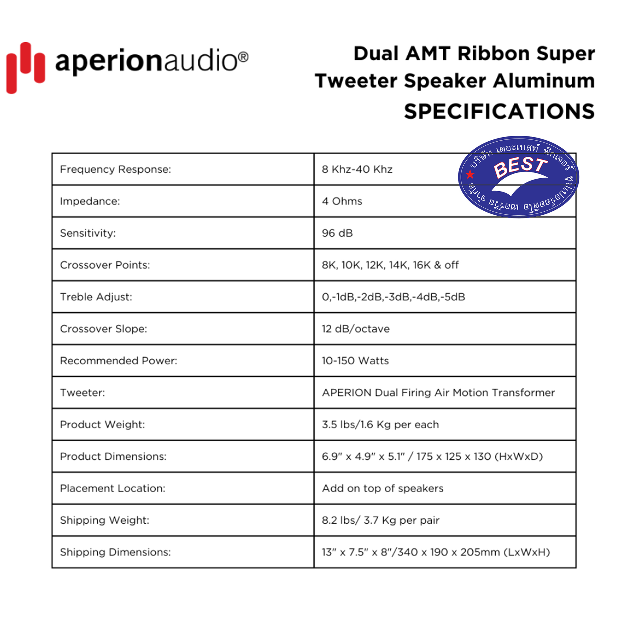 Specification Frequency Response:8 Khz-40 Khz Impedance:4 Ohms Sensitivity:96 dB Crossover Points:8K, 10K, 12K, 14K, 16K & off Treble Adjust:0,-1dB,-2dB,-3dB,-4dB,-5dB Crossover Slope:12 dB/octave Recommended Power:10-150 Watts Tweeter:APERION Dual Firing Air Motion Transformer Product Weight:3.6 Lbs / 1.6 Kg per each Product Dimensions:H 6.9" x W 4.9" x D 5.1" H 175mm x W 125mm x D 130mm Placement Location:Add on top of speakers Shipping Weight:8.2 Lbs / 3.7 Kg per pair Shipping Dimensions:L 13" x W 7.5" x H 8" L 340mm x W 190mm x H 206mm