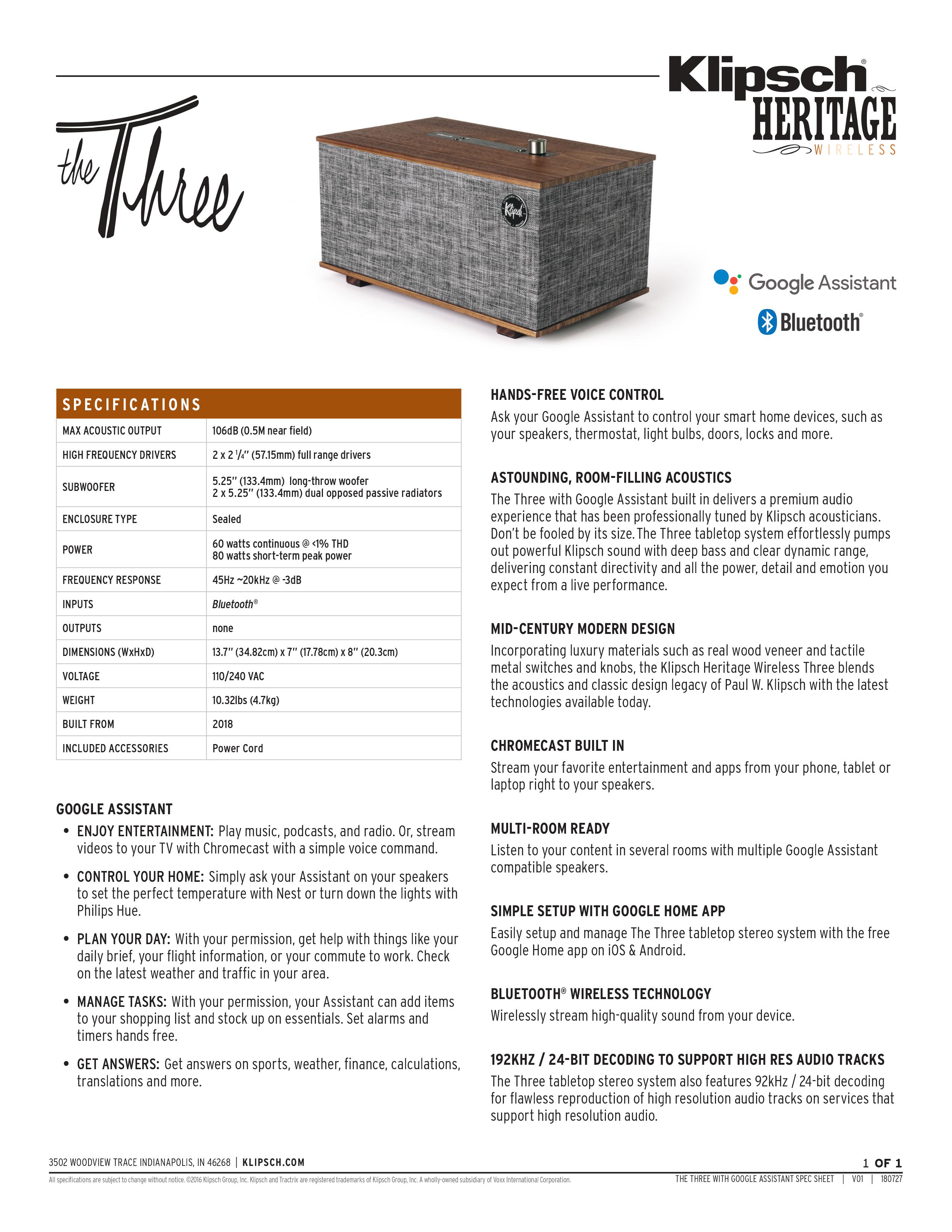 รายละเอียดทั่วไปกลับมาอีกครั้งกับแบรนด์ชั้นนำอย่าง Klipsch ที่เป็นที่รู้จักกันในฐานะผู้นำทางด้านลำโพงและเครื่องเสียงอันหลากหลาย ในครั้งนี้เรียกได้ว่าเป็นการอัพเกรดรุ่นยอดฮิตให้มีความทันสมัยครบเครื่องมากยิ่งขึ้น กับรุ่น The Three ที่ปัดฝุ่นอัพเกรดหน้าตาและความสามารถออกมาเป็นรุ่น The Three With Google Assistant ที่ต้องบอกว่าทันสมัยทันเทรนด์ปัจจุบันที่ Speaker ส่วนใหญ่นั้นรองรับความเป็น Smart Speaker ที่นอกจากจะฟังเพลงแล้วยังสามารถรับฟังคำสั่งและจัดการสิ่งตาม ๆ ด้วยเสียงของเราโดยไม่จำเป็นต้องไปกดเรียกใช้ใด ๆ นั่นเอง โดยยังมาพร้อมรูปทรงแบบวินเทจเช่นเคย ปรับปรุงในส่วนของสีใหม่และปุ่มควบคุมด้านบนให้ดูมันสมัยและใช้งานได้ง่ายดายมากกว่าเดิม หยิบยกได้ง่ายด้วยน้ำหนักเพียง 4.7 กิโลกรัม มาพร้อมกับการใส่ Google Assistant ที่สามารถเรียกดใช้ด้วยเสียงได้ไว้ภายในตัว ขับเสียงได้อย่างทรงพลัง กระหึ่ม ดังทั้งห้อง เหมือนยกเครื่องดนตรีมาตั้งเล่นอยู่ภายในห้องเลยทีเดียว ที่สำคัญยังรองรับการเชื่อมต่อหลายตัวแบบแยกห้องผ่านลำโพง Google Assistant หลากหลายรุ่นที่รองรับ อย่าง Multi-Room อีกด้วย ให้คุณควบคุมระบบได้ทั้งบ้านว่าจะให้เสียงออกห้องใดหรือให้ห้องไหนเปิดเพลงหรือโปรแกรมใดได้อย่างง่ายดายแค่ปลายนิ้วผ่าน Smartphone ที่สำคัญยังคงไว้ซึ่งรูปร่างที่ดูคลาสสิค หรูหรา แต่ก็ยังเต็มไปด้วยความทันสมัยอยู่ภายในตัว ขับเสียงออกมาแบบ Stereo ไม่จำเป็นต้องตั้งคู่เพื่อแยกเสียงให้วุ่นวายแต่อย่างใด ภายในมีไดร์เวอร์ขับเสียงที่ครบครันทั้งย่านสูงและกลางขนาด 57.15 mm. ถึง 2 ตัว ย่านต่ำกลางที่ยังคงไว้ซึ่งเอกลักษณ์ของแบรนด์ด้วยไดร์เวอร์ Subwoofer แบบ Long-Throw ขนาด 133.4 mm. และตัวกระจายเสียง Passive Radiotors แบบคู่ขนาด 133.4 mm. 2 ตัว รองรับความถี่เสียงที่ 45Hz ~20kHz @ -3dB รองรับการเชื่อมต่อไร้สายอย่างสมบูรณ์แบบผ่าน Bluetooth พร้อมด้วย Google Chromecast ภายในตัวให้คุณสามารถ Streaming เพลงที่คุณชื่นชอบผ่าน App ที่รองรับบน Smartphone ได้ตามต้องการ และที่สำคัญยังตั้งค่าได้อย่างง่ายดายด้วย Google Home App เรียกได้ว่าสะดวกแบบสุด ๆ การเชื่อมต่อ