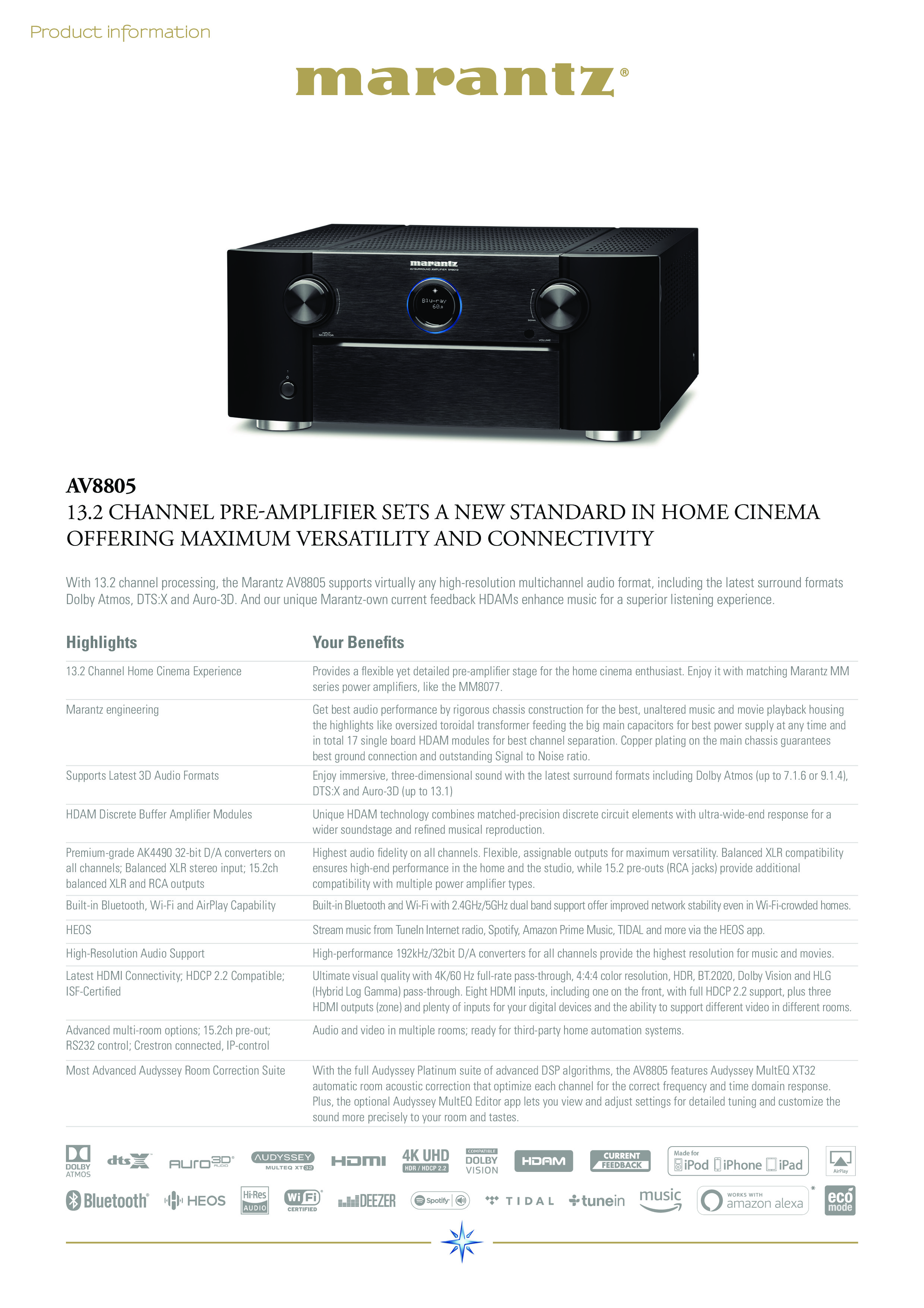The versatile Marantz AV8805 pre-amplifier redefines the audiophile home cinema and music listening experience with an unprecedented 13.2 channel processing capability, and support for virtually any high-resolution multichannel audio format. With the latest surround formats like Dolby Atoms, DTS:X or Auro-3D you can also immerse yourself in the wonder of three-dimensional audio. This enhanced audio quality is made possible by our proprietary current feedback and HDAM technology that passes signals through a 15.2 channel XLR or 15.2 RCA output. To top it off, you can also stream music throughout your home with HEOS multi-room listening and full wireless connectivity through the HEOS app or Amazon Alexa Voice Control*, supported by Wi-Fi, Bluetooth and Apple Airplay. With the Marantz AV8805, you get incredible fidelity and unparalleled audio precision. * The Amazon Alexa feature becomes available in Spring 2018. Availability varies by country. |