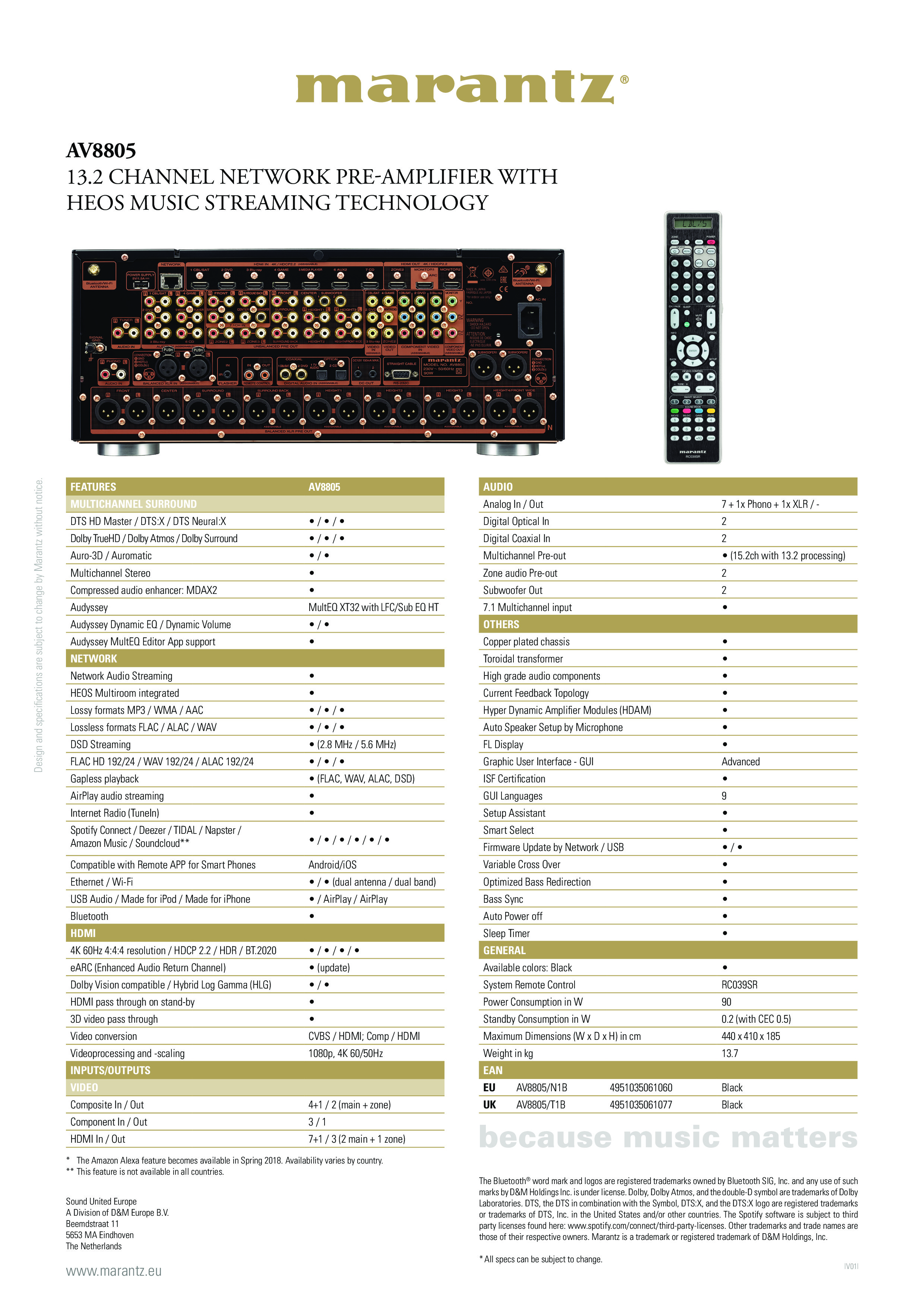 Founded in 1953, Marantz has a long and rich history of designing audio components embraced by music lovers and critical listeners around the world. Because Music Matters, the AV8805 carries on our long tradition of delivering a best-in-class listening experience for music and cinema.